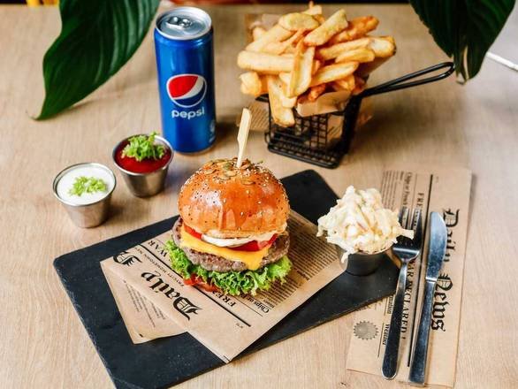 Hambúrguer com Bebida e Batatas Fritas