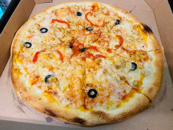 Molho de tomate, mozzarella, frango, cebola vermelha, pimento e azeitonas.