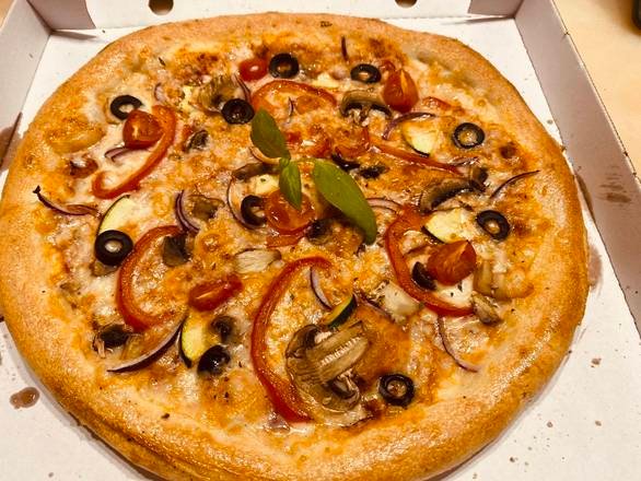 Molho de tomate, mozzarella, cogumelos, pimento, courgette, cebola roxa, tomate cereja, azeitonas, Milho Doce e orégãos.